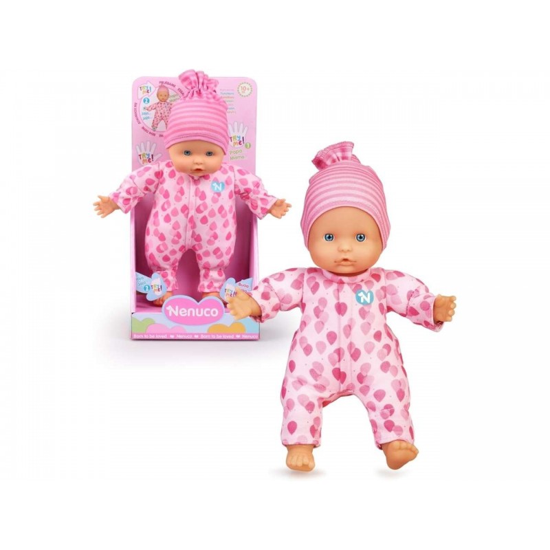 Bambola Nenuco morbida con vestitino rosa o azzurro. Se tiene il ciuccio sarà tranquilla, ma non appena lo si toglie inizierà a piangere.